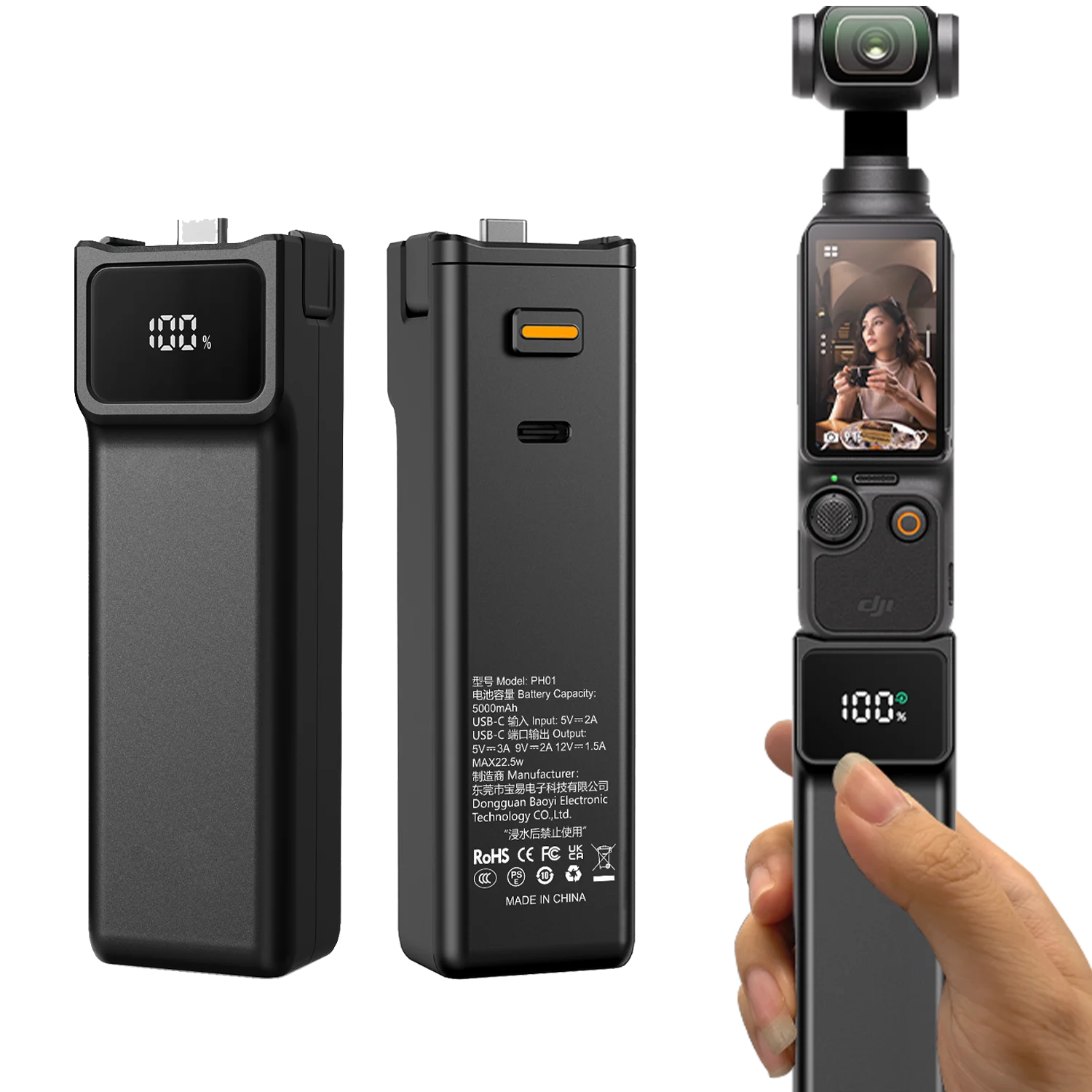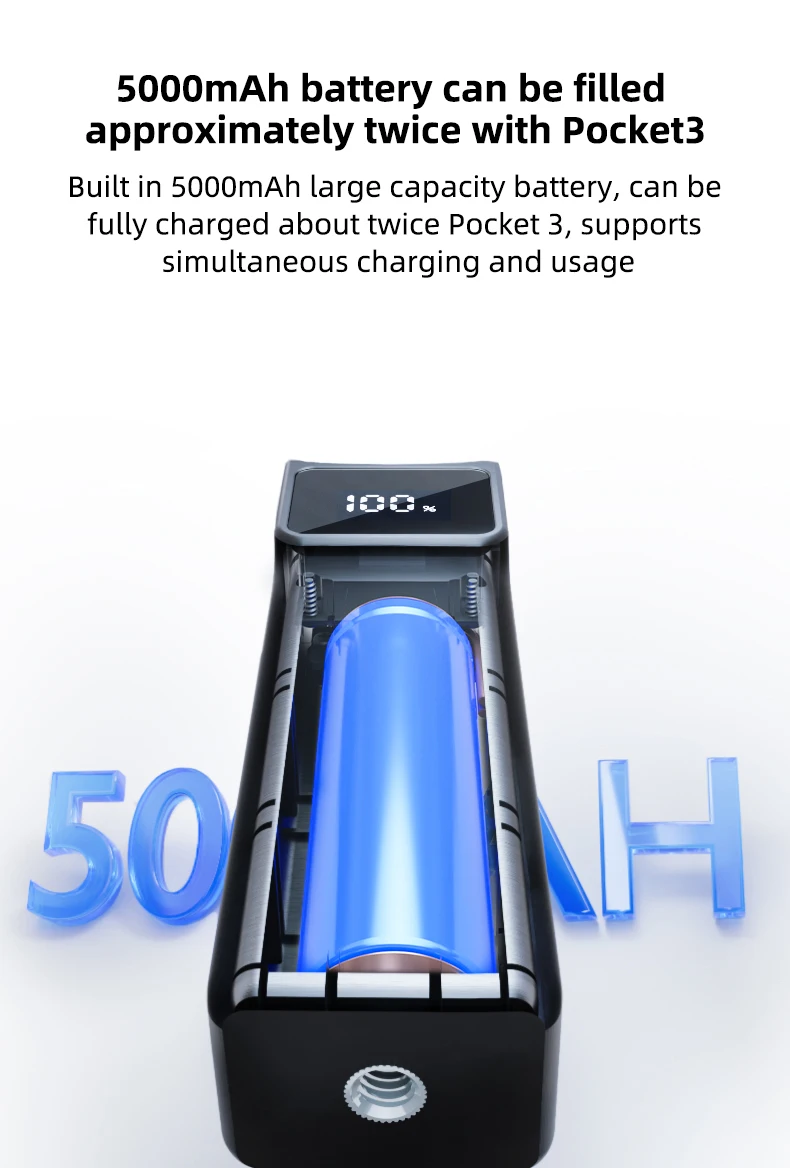 LARGE CAPACITY GRIP BATTERY:Battery Handle Built-in 5000mAh battery provides 180 minutes of additional use for the Pocket 3 and charges the Pocket 3 approximately twice.